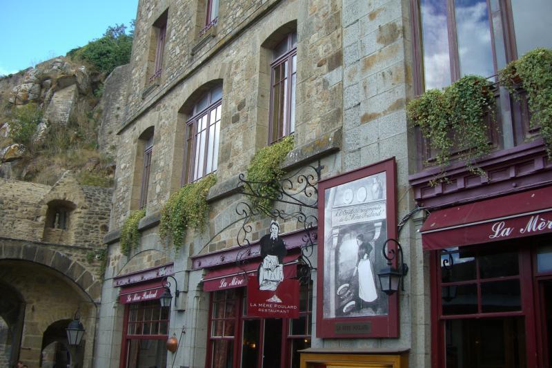 | Enseigne de la La « Mère Poulard » (1851-1931), qui fut une célèbre cuisinière mondialement connue pour son auberge et sa fameuse omelette. |